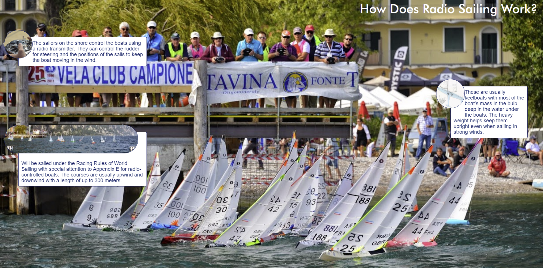 Radio sailors enforce the rules themselves. Competitors not racing act as observers and hail contact between boats. Skippers are expected to take a penalty if they have broken a rule.